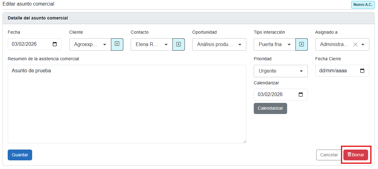 3. Pulsa en "Guardar" para crear el asunto comercial.