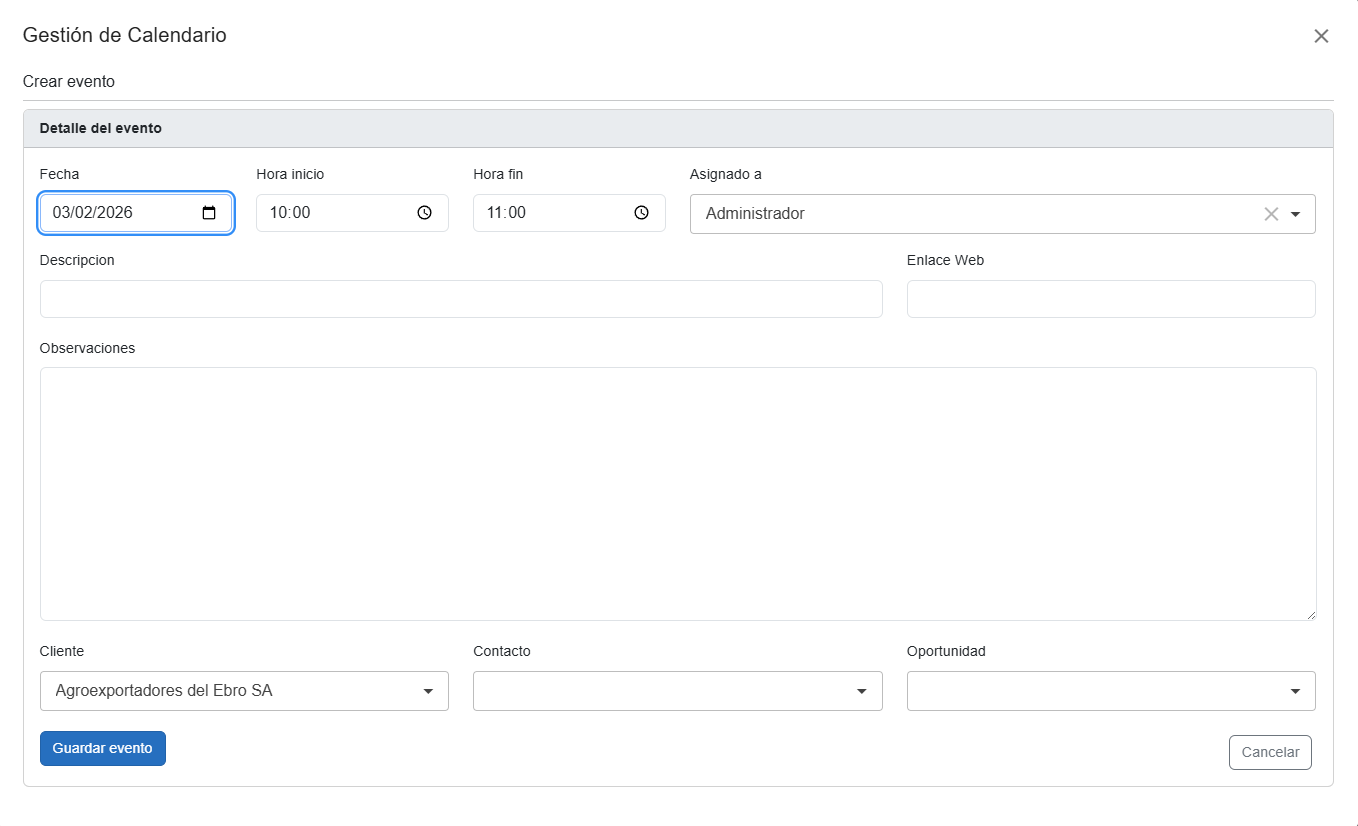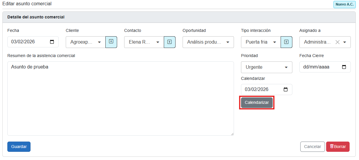 El botón “Calendarizar” permite transformar un asunto comercial en un evento del calendario CRM. ![]()