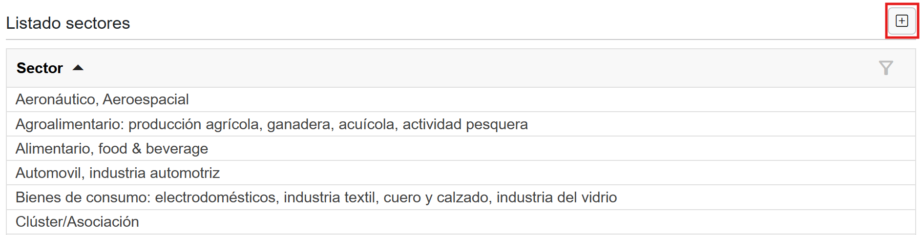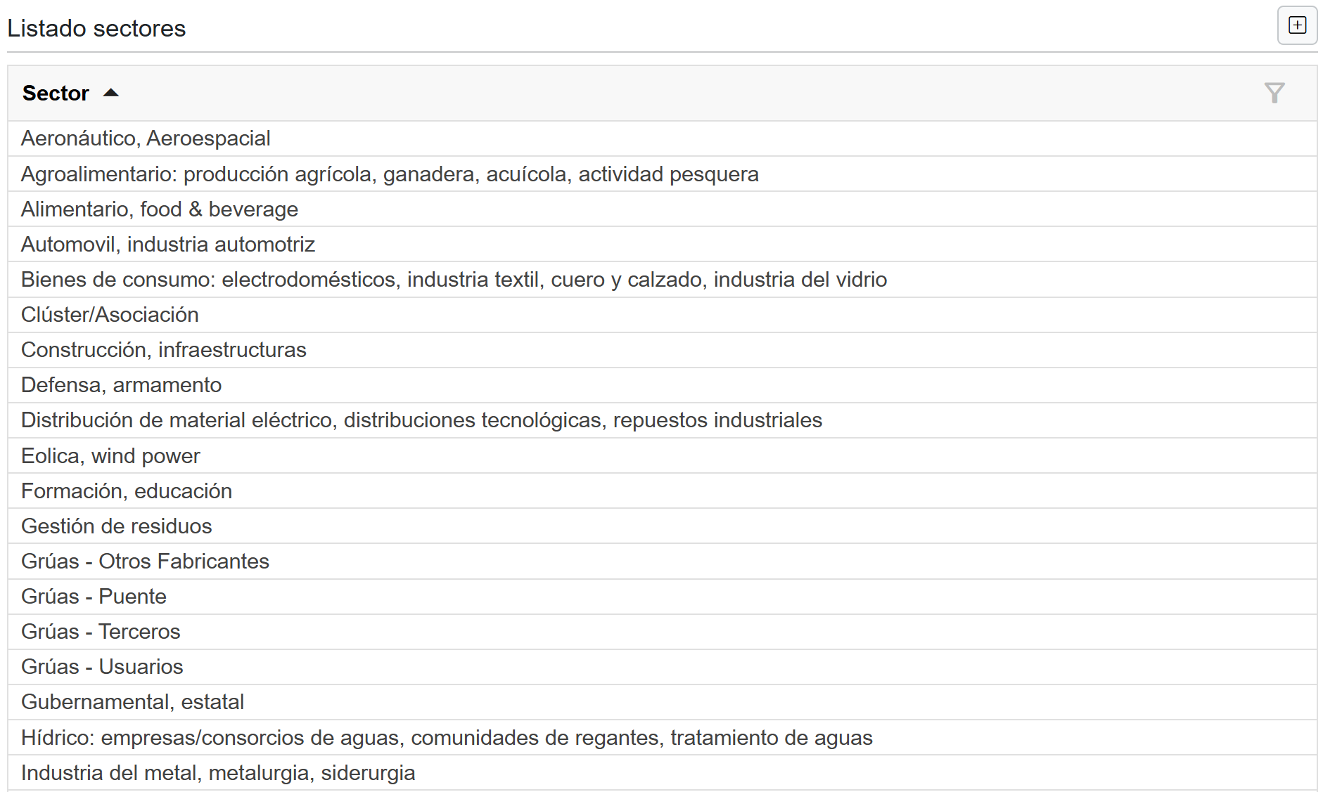 Sirve para alimentar la casilla “Sectores” cuando se rellena el formulario de cliente nuevo, garantizando una categorización coherente y homogéneas.